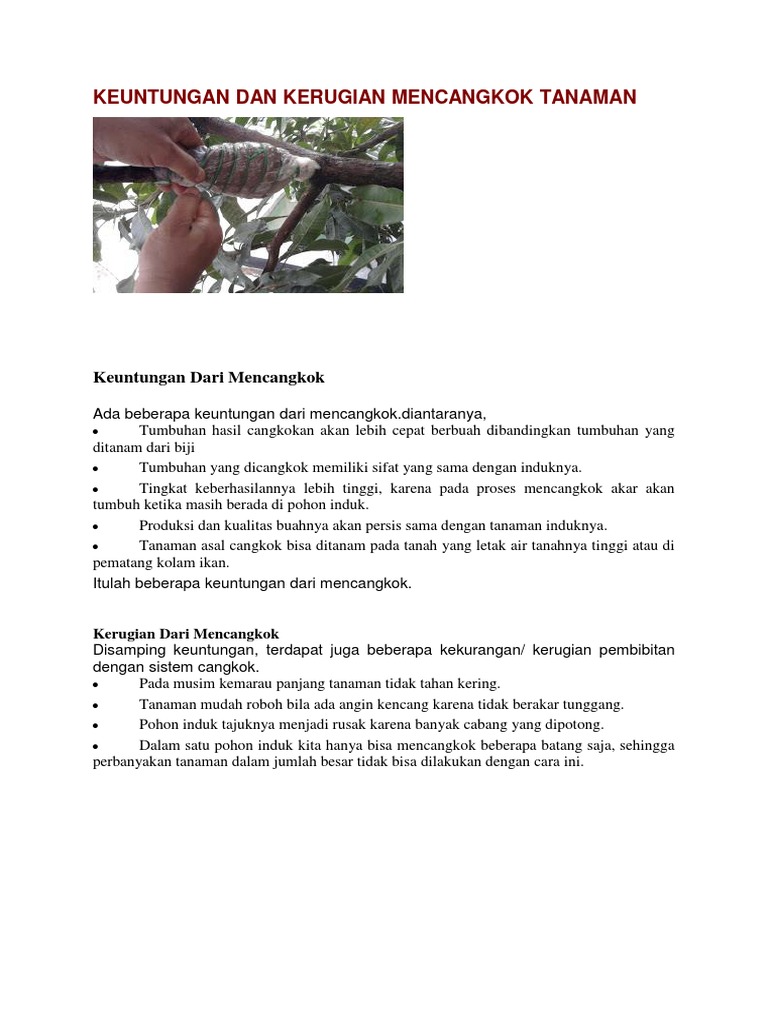 Kerugian Dari Mencangkok Disamping keuntungan terdapat juga beberapa kekurangan kerugian pembibitan dengan sistem cangkok. Sifat anakan akan mengikuti sifat induknya. Beberapa keuntungan dan kerugian.